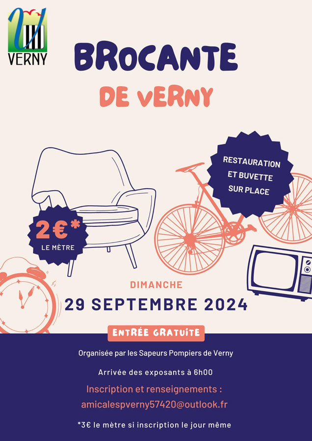 Pour obtenir les informations nécessaires et le bulletin d'inscription consultez https://brocabrac.fr/57/verny/1094877-brocante-st-michel-sapeurs-pompiers-verny ou envoyez un mail à