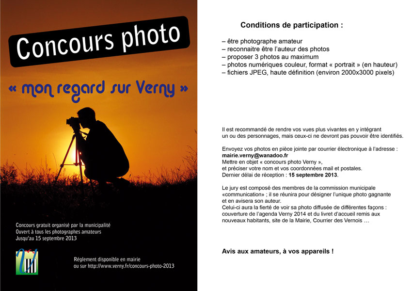 Comme tous les 2 ans la municipalité organise un concours photo gratuit sur le thème « mon regard sur Verny », en faisant appel à votre imagination.