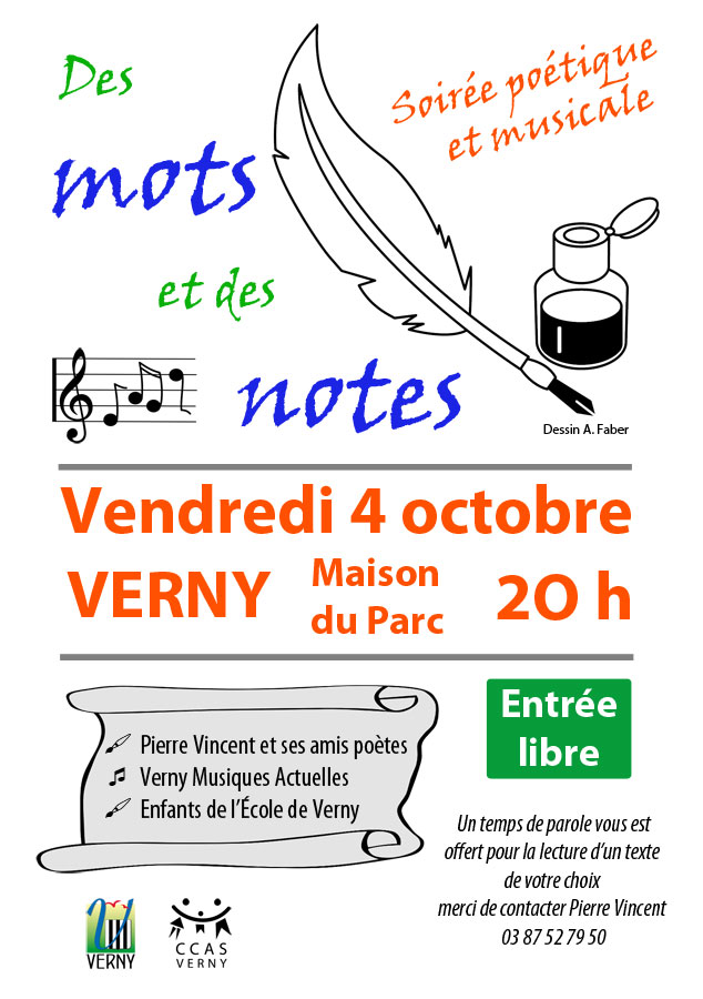 - Vendredi 4 à 20 h à la Maison du Parc, tous les habitants pourront profiter d’une soirée poétique et musicale proposée par Pierre Vincent, ses amis poètes, des enfants de l’école, Fabrice Ach et ses amis musiciens. Ceux qui le désirent peuvent également lire ou faire lire un texte de leur choix. (d’autres détails sur les affichettes).