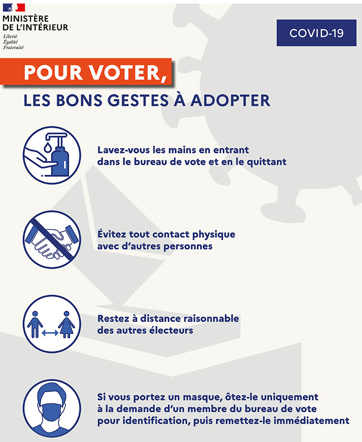 Les préconisations prévoient un lavage des mains à l'entrée et un lavage des mains à la sortie. Eviter l'attroupement à l'extérieur du bureau de vote.