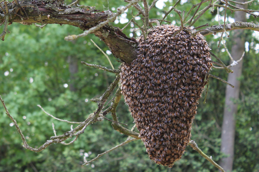 Au printemps, dès qu'une nouvelle reine naît dans une colonie la vieille reine quitte la ruche avec environ la moitié des abeilles qui la protègent en formant une sorte de grappe en attendant de trouver un nouvel abri pour y établir une nouvelle colonie.