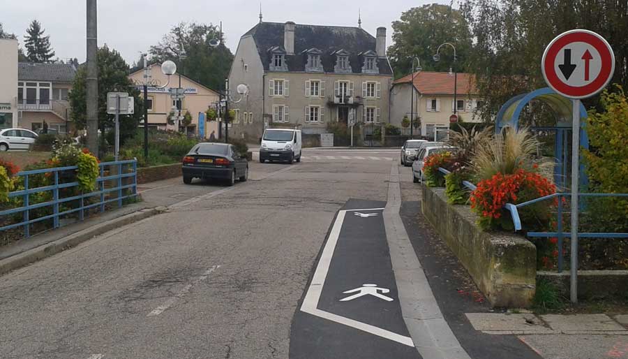 Le passage du pont de la pharmacie est maintenant équipé d’une nouvelle signalisation. Il s’agit du panneau à deux flèches (B15). Les usagers venant de la rue de la Mairie et se dirigeant vers la rue Nationale (flèche rouge) doivent céder le passage à ceux circulant en sens inverse (flèche noire) de manière à libérer la zone piétons matérialisée avec de la peinture blanche (cliquer sur le panneau pour voir la photo).