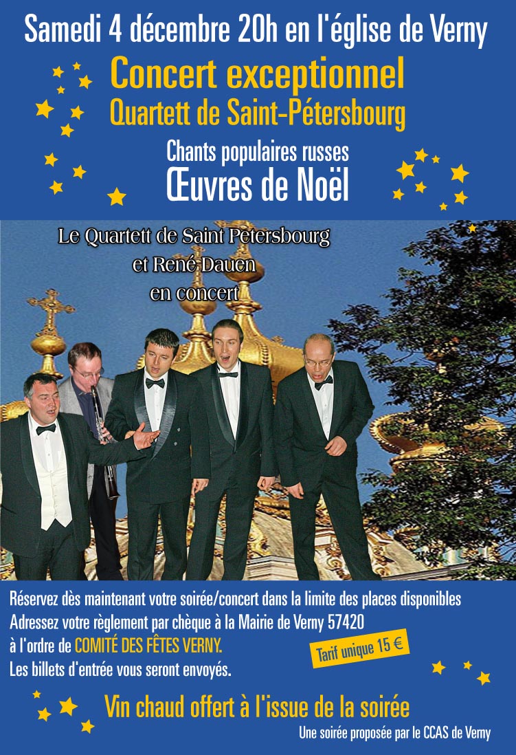 Au programme : chants populaires russes et œuvres de Noël.Samedi 4 décembre à 20 h à l'église de Verny - tarif 15 €. Réservation des maintenant, dans la limite des places disponibles.